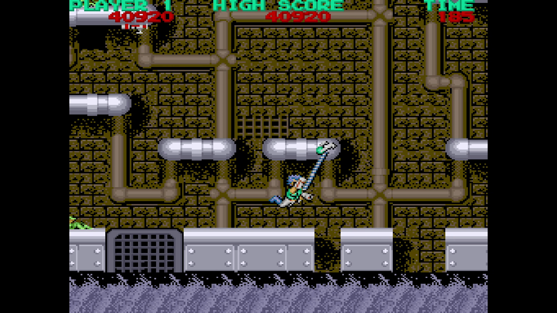 The original Arcade game that started it all. The game starts off simple enough, but begins to shake you down for your lunch money by the time you reach the second level. The basic gameplay consists of using your grappling arm to climb and swing your way across each level, while shooting down any enemy that gets in your way. There are bonus items and weapon upgrades parachute in, although good luck keeping them for very long because you will get mowed down by the enemies pretty quickly. There are only 5 stages and the entire game takes about 15 minutes to complete, which was fairly typical of arcade games of the time.