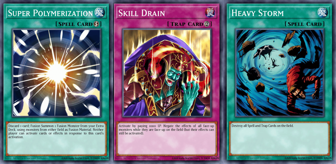 Remember how I said that the GG spells and traps have those floating effects? Whip out a Heavy Storm! Set those spells and traps and let it rip, baby. While you may not get the benefit of their first effects, the floating effects are just as good, letting you add one of The Big 3 to your hand at the cost of banishing the spells or traps from your graveyard. You could even use Card Destruction to send your whole hand to the GY, draw a new hand, and BAM - you've not only dumped the spells and trap into your GY, but you've also dumped The Big 3 into the GY and you're all setup for GG Combined.