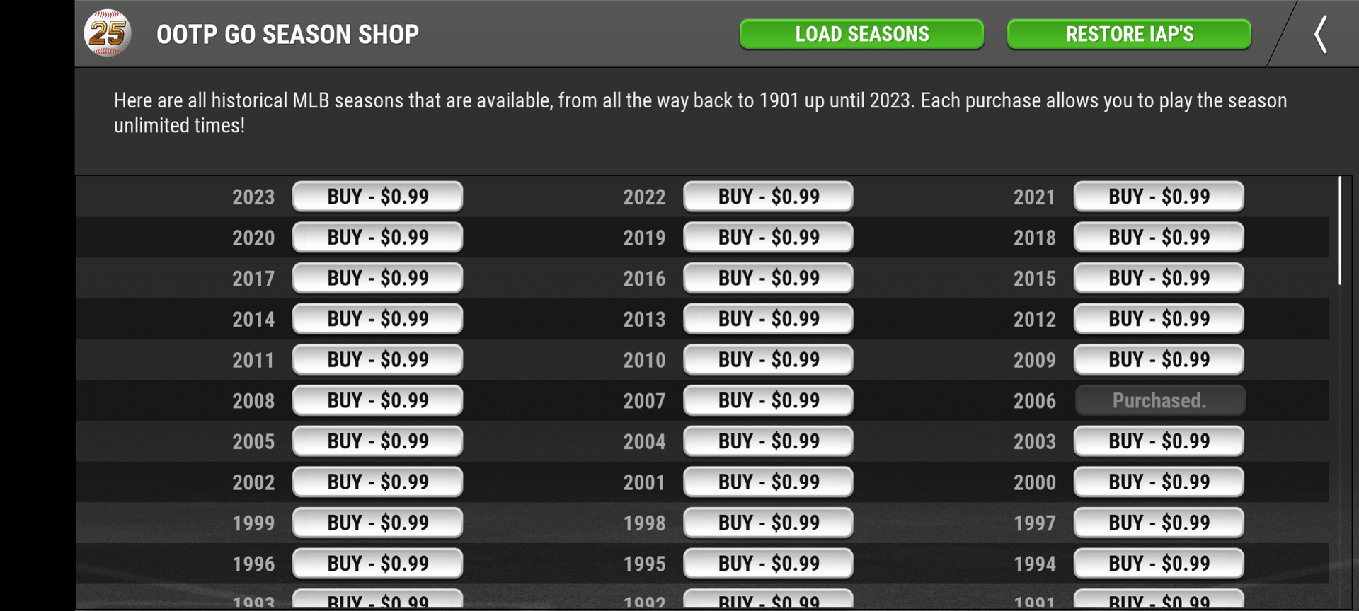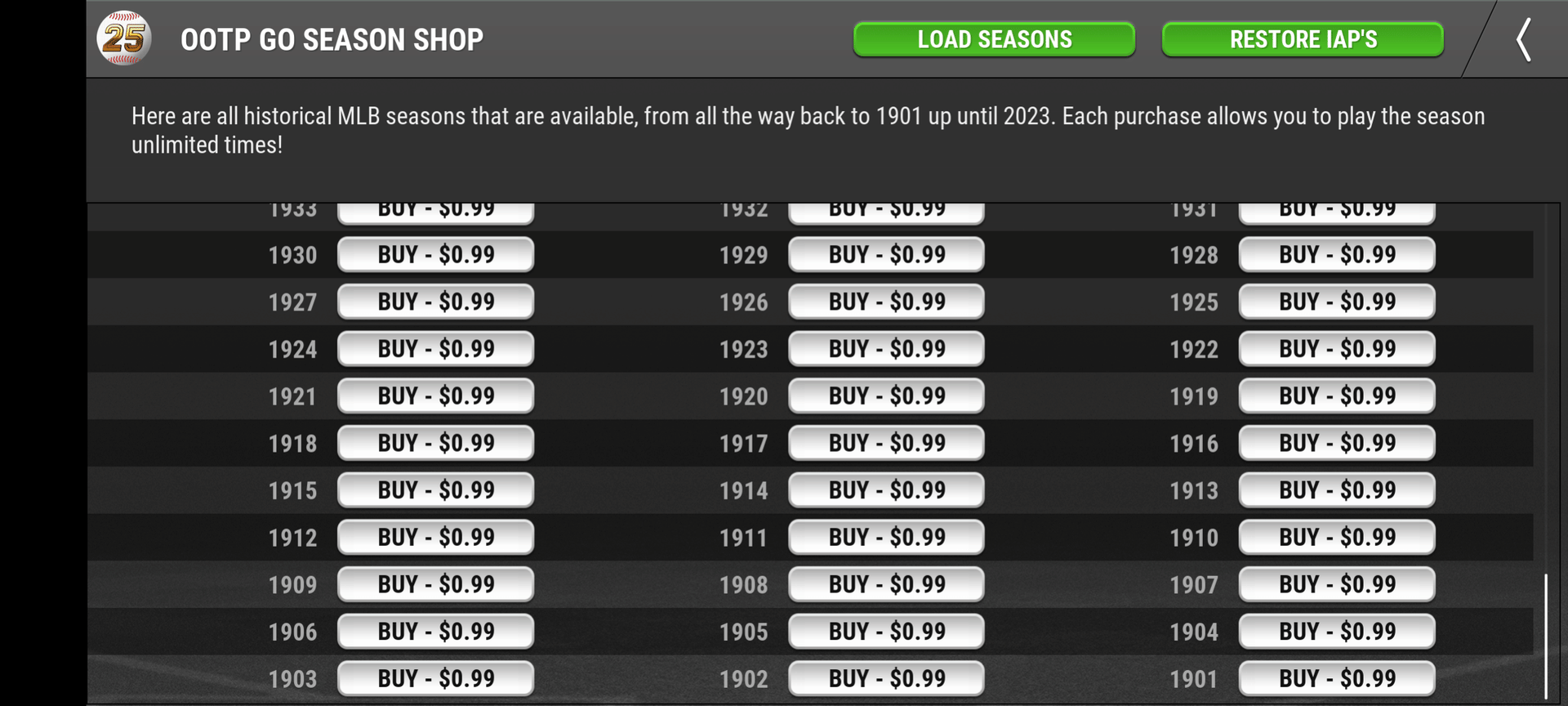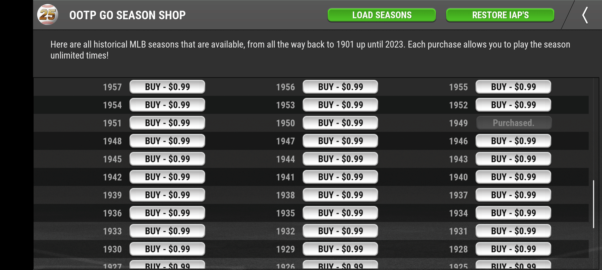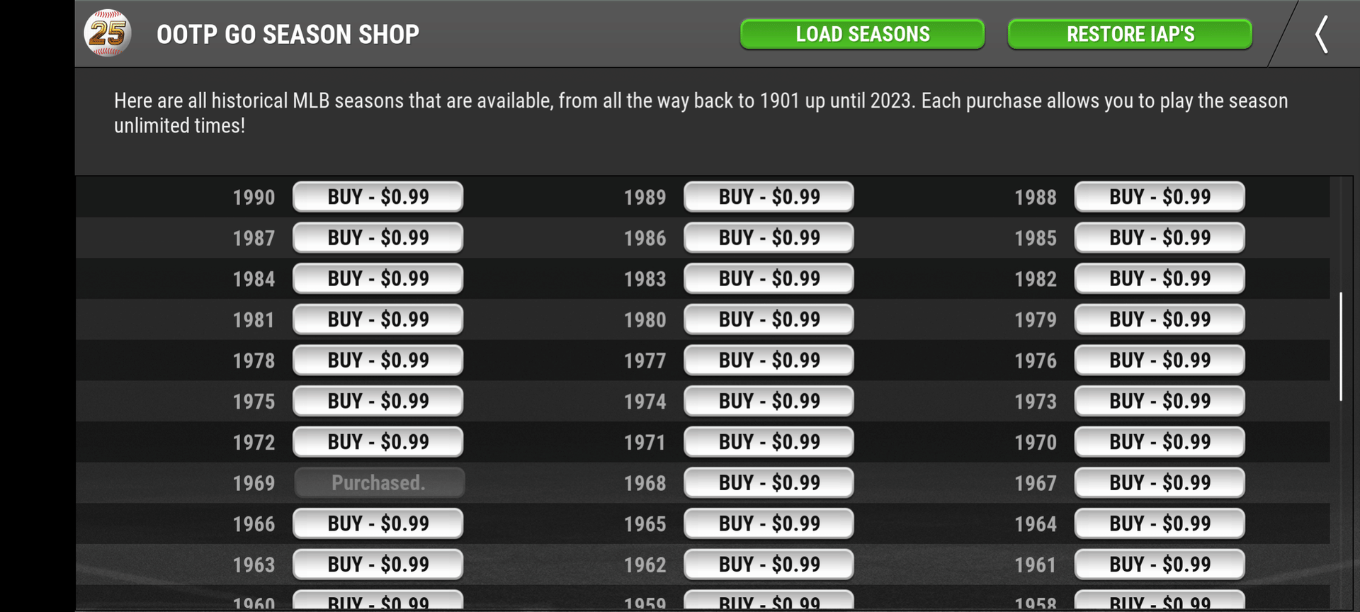 Any MLB Season can be yours for the low, low price of $0.99. This game has literally every single player from every single team in the history of baseball.