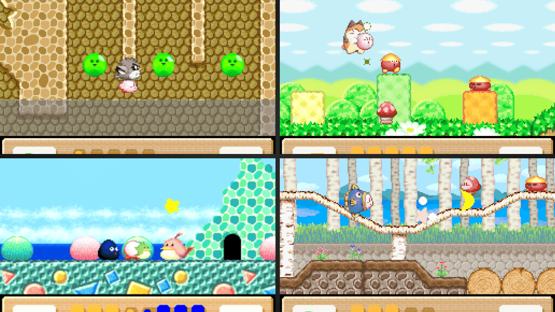 Kirby's Animal Friends from Dream Land 2 are back, and they're better than ever! Returning are Rick the Hamster, Coo the Owl, and Kine the Ocean sunfish. Brand new to the game are Nago the Calico cat, Pitch the Bird, and ChuChu the Octopus. Each one has a radically different playstyle and unique variations of Kirby's copy abilities. At certain points in each level, you can take one of the Animal Friends with you to get through the level in different ways, adding a surprising amount of replayability to the game.