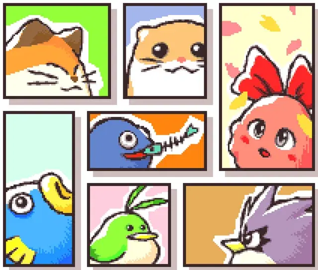 Image: Top-left: Nago, top-center: Rick, top-right: ChuChu, center: Gooey, bottom-left: Kine, bottom-middle: Pitch, bottom-right: Coo.
