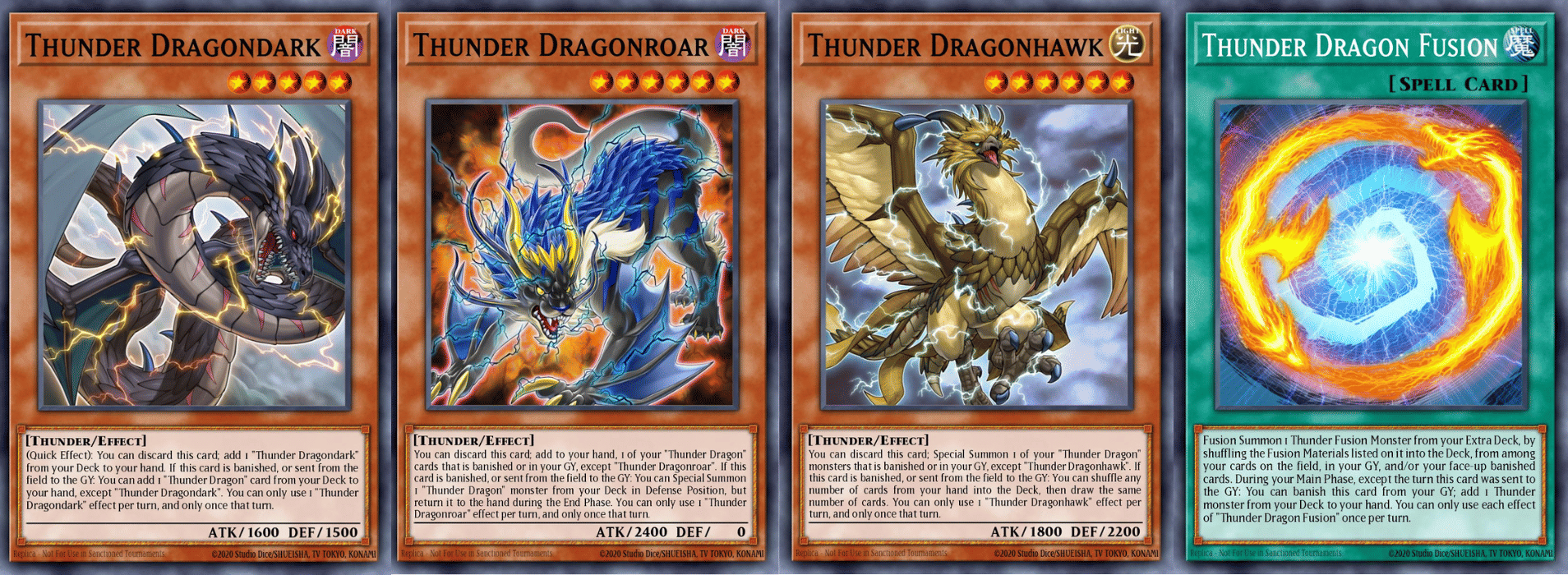 Thunder Dragondark: Can be discarded from the hand to add another Dragondark from your deck to your hand. When banished, lets you add a Thunder Dragon card from your deck to your hand.