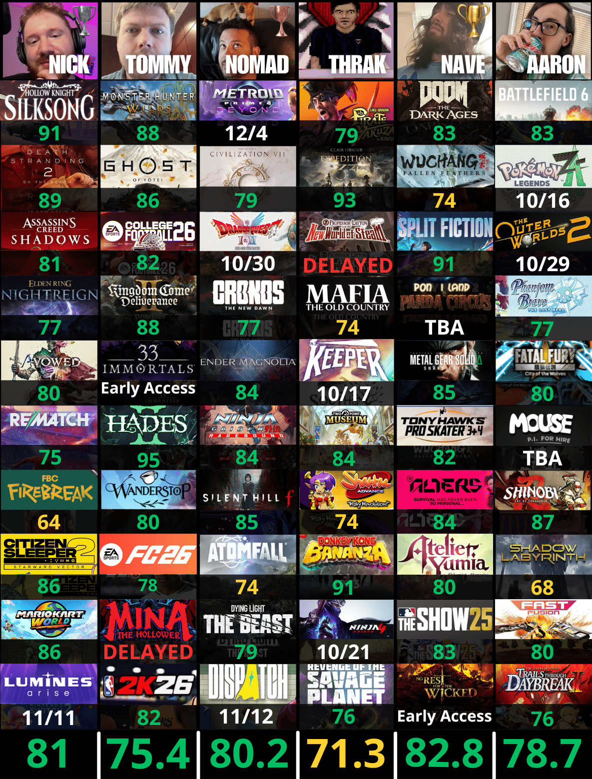 --Nave: In last place, Nave goes all-the-hell-in on March and was hit by two delays. The Alters being moved out of March and Replaced moved out of 2025 altogether. He was able to use his trades to swap Replaced for Metal Gear Solid Delta and Wuchang for Tony Hawk's Pro Skater 3+4. He now has no more trades!
